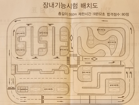 장내기능시험 배치도 이거 학원에서 나눠주는데 사실 난 열심히 안봤음... 어차피 장내기능 연수 받을때 4시간쯤 받다 보면 도로지도가 이미 머릿속에 다 외워지므로 이걸 엄청 자세히 볼 필요는 없지만 한번쯤 훑어보면 좋다.