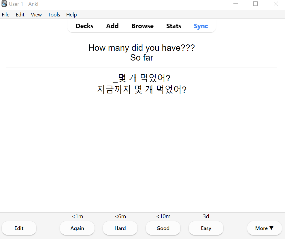 이게 첫날에는 이렇게 나오지만, 며칠 뒤에 해당 deck을 다시 눌러서 학습할 때는 easy를 누르면 3 day가 아니라 좀 더 긴 기간으로 month 등이 잡히기도 한다.