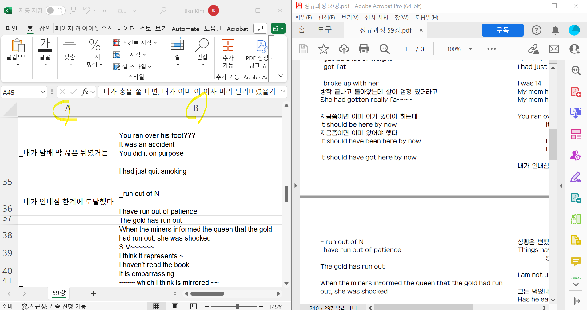 이를 Anki앱에 넣기 위해선 일단 Excel 파일 형식으로 만들어야 한다. 그래서 좀 귀찮지만 excel 파일을 열어서 pdf파일에 있는 학습 내용을 덩어리 별로 잘라서 excel 파일에 복붙 해서 넣어준다.