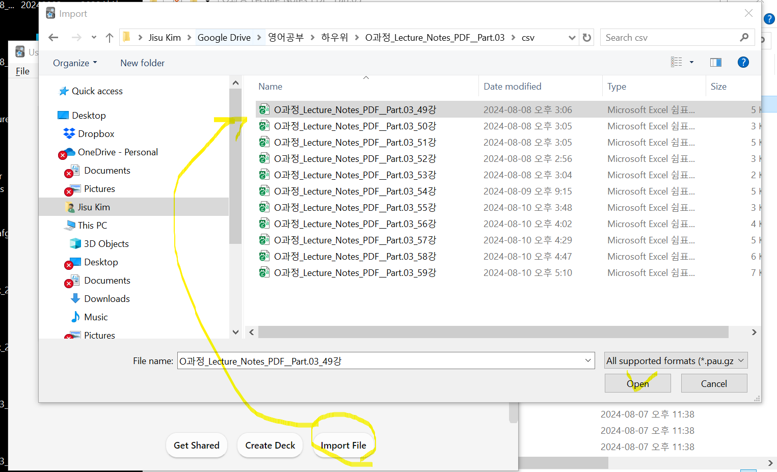 Anki에서 import하기 위해선 일반 excel파일은 불가능하고, csv파일만 가능하기 때문이다. (내 컴퓨터의 경우에는, 파일형식에서 드롭다운을 누르면 CSV형식이 여러 개가 나왔었는데, 밑의 사진처럼 CSV UTF-8(쉼표로 분리) ->요걸 눌러야 오류 없이 import가 잘 됐었다.)