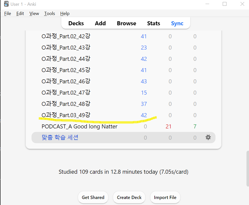 좌측 파란 글씨부터 순서대로 New/Learn/Due를 나타내는데, 오늘 학습해야 할 새(new) 단어가 42개라는 뜻이다.