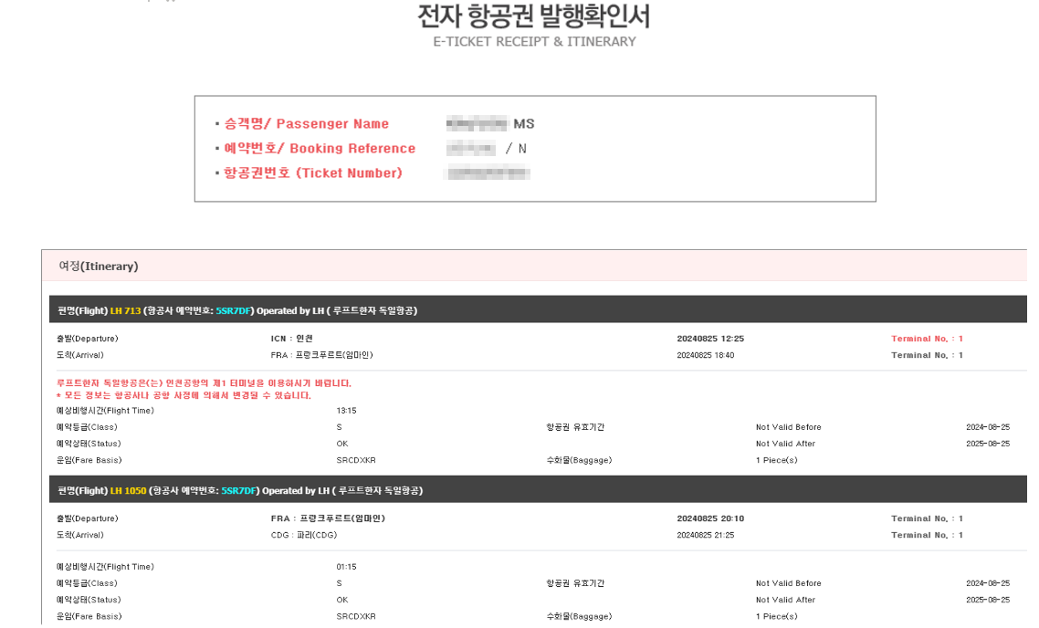 아래는 루프트한자 어플에 들어가서 직접 내 항공권 세부정보를 캡처해서 넣어둔 것이다. 비행기 편명, 수하물 무게, 비행시간, 터미널 정보(인천공항, 프랑크푸르트 공항, 샤를드골 공항 등)등을 알 수 있다.