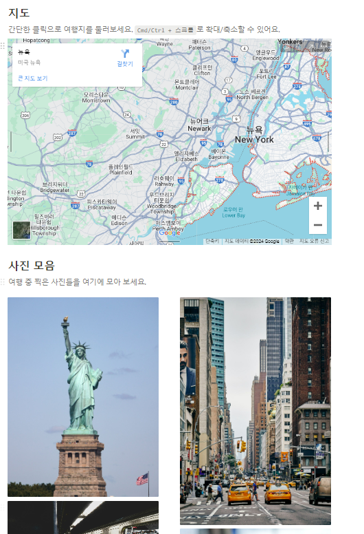 지도나 사진모음도 기본 템플릿으로 들어가는데 나는 굳이 요 항목들은 사용 안 해서 지워버렸다. 자신에게 맞게 커스터마이징 하면 된다.