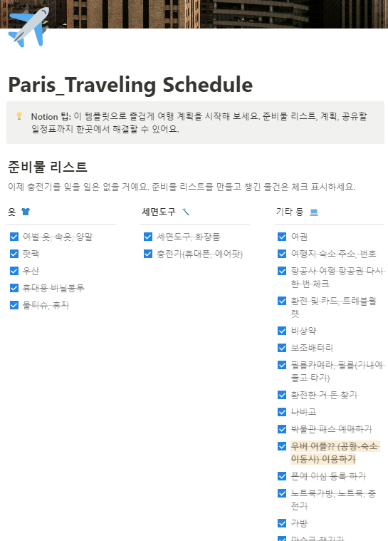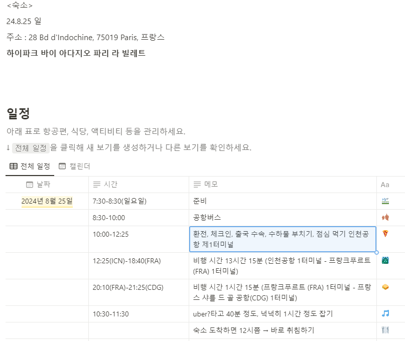 그리고 프랑스 여행에서 아무리 노션 템플릿을 별로 안 썼다고 해도, 나는 출국날에는 이 노션앱을 꼭 활용한다. 왜냐면 휴대폰에 노션 어플을 다운받아두면 pc에서 기재해 둔 내용과 연동이 되기 때문에 무척 편하기 때문이다.