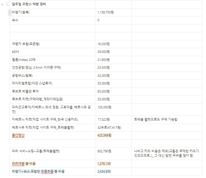 물론 프랑스 여행 경비 정리를 할 때 엑셀을 이용하면 좀 더 편하고 멋들어지게 정리할 수도 있겠지만, 내 경우엔 노션을 쓰는 목적이 이 여행과 관련된 모든 정보를 하나의 플랫폼에 때려 넣으려고 하는 것이다 보니, 이 정도 표만 제공해 줘도 충분히 감사했다.