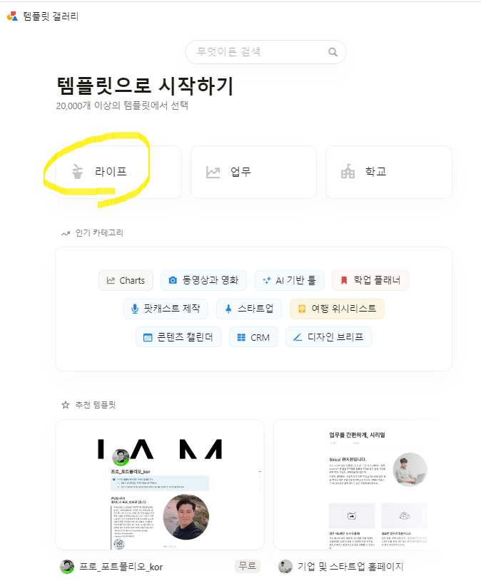 2) '라이프'를 누른다. (or 검색창에 '개인위키'검색)