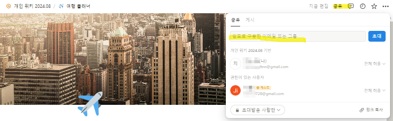 맨 윗줄의 '공유'를 누르고 네모 박스에 동행인의 메일주소를 넣고 초대를 누르면, 게스트로 초대가 된다. 게스트에게 전체 허용 권한을 주면 게스트도 해당 여행 플래너 페이지를 보고 수정할 수 있게 된다.