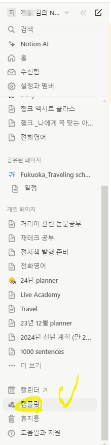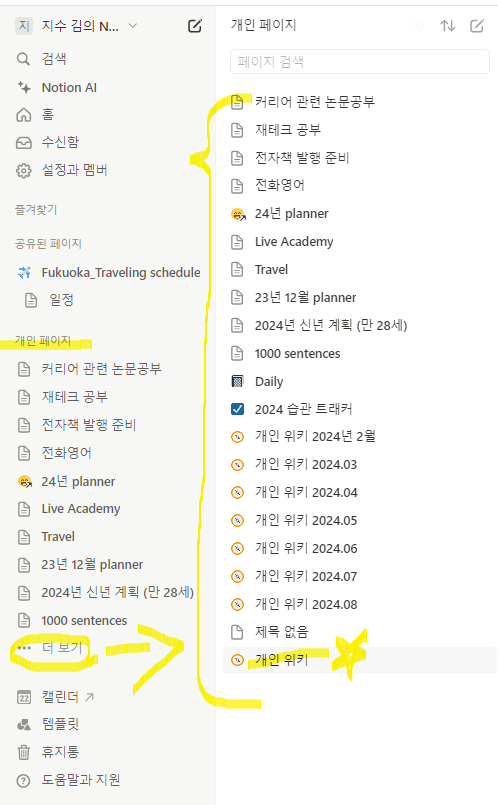 4) 노션 화면에서 좌측 탭의 [개인페이지] 항목에서 [더 보기]를 누르면 새로 추가한 '개인위키'가 뜬다. 이걸 클릭하면