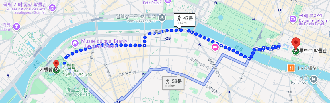 대충 루브르 박물관 겉에만 구경하고 에펠탑까지 걸어가려고 구글맵을 켰다.