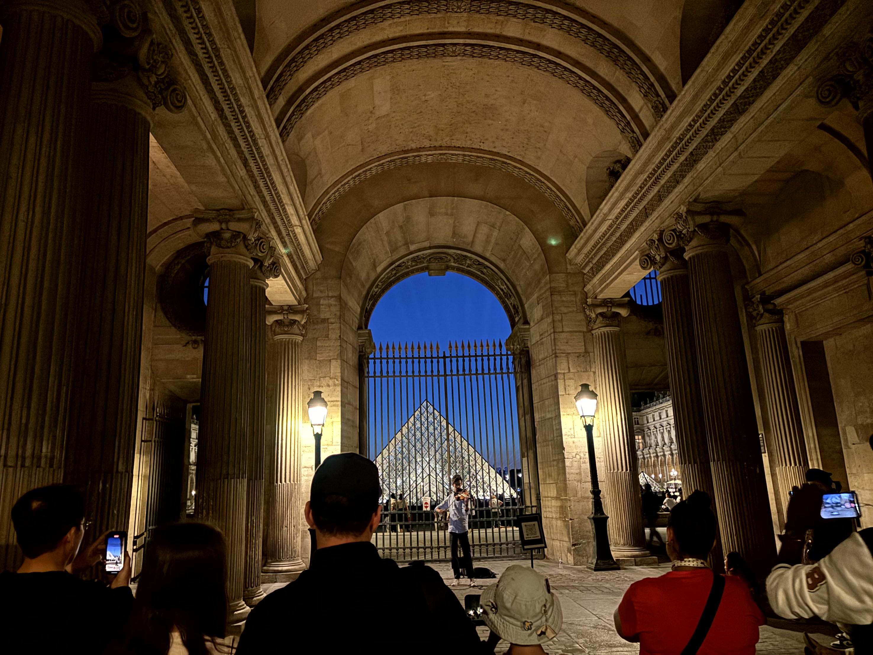 여기서 길거리 바이올린 연주를 하시는 분이 계셔서 사람들이 모여 있었다. 뒤로 루브르 박물관의 상징인 유리 피라미드가 보였다.