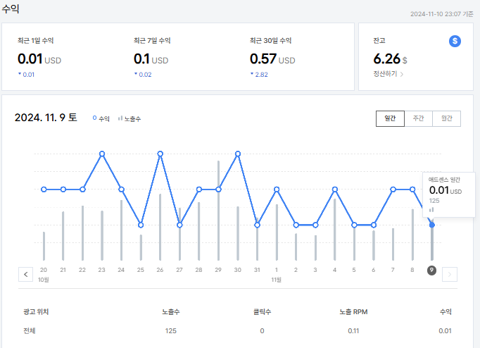 사실 내 블로그는 아주 소규모의 노 인기 블로그이기 때문에 큰돈이 되지는 않는다..ㅋㅋㅋ 정말 티끌 모아 티끌인 수준임.. 그래도 난 요 정도의 금액도 너무 신기하다. 매일 0.01 USD가 모인다는 게 신기함... 내 글을 누가 본다고?라는 생각이 들면서 나름 더 열심히 하고 싶어 진다. ㅎㅎ