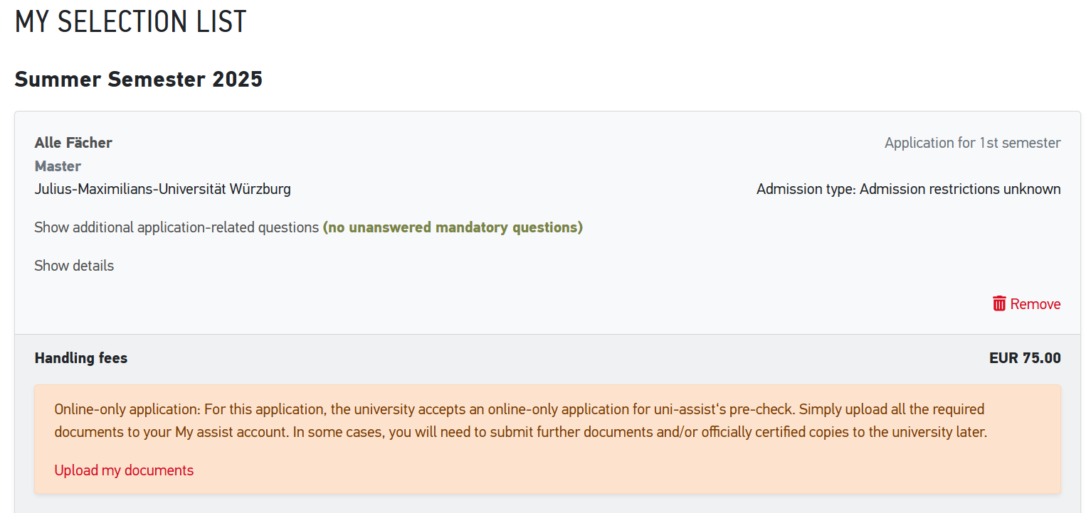 결제 전에 additional application-related questions도 한 바가지 작성해 놨고, documents 미리 다 업로드해뒀다. 뷔르츠부르크 대학교의 내가 지원하려는 major의 경우는 우니아시스트에서 VPD를 미리 받고 난 뒤에, 이 VPD를 가지고 다시 자기네 지원 포탈에 추가 서류들과 업로드해야 하기 때문에.. 여기 우니아시스트에는 랩로증명서/인턴 증명서 업로드를 하지 않고 지원 포털에서 업로드 할 생각이다!(왜냐면 증명서 발급이 이번주 금요일에 나온댔고.. 나는 내가 대사관 말고 다른 방법으로 사본공증 받은 다수의 certi들이 별 문제없이 우니아시스트에서 통과되는지 빨리 확인하고 싶었다.)