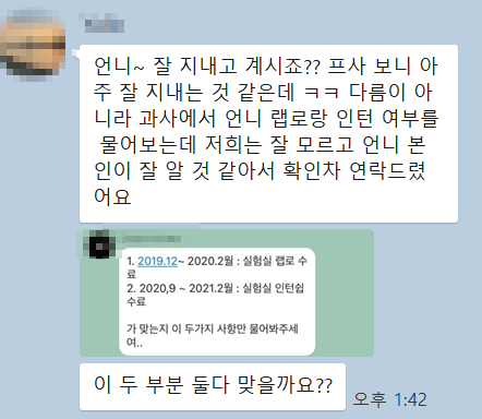 근데 슬프게도 내가 졸업한 석사 실험실은ㅋㅋㅋㅋ ㅈ소기업 같은 곳이므로... 이전에 근무했던 랩로학생, 인턴생 등의 근무기록을 관리하거나 기록 대장에 기록하거나... 따로 그렇게 하지 않았다.. 애초에 시스템이 없음... 그래서 실험실에 있는 사람들 중 아무도 내가 언제 무슨 주제로 인턴을 했는지 전혀 모르므로(기억도 못함).... 내게 되물었던 것...ㅋㅋㅋㅋ (과사에서도 이런 경우는 첨이라고 어이없어함...ㅠ 빨리 탈출하길 잘했다 :) )