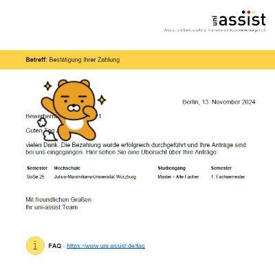 추가로 오늘은 3군데 대학 중에 한 군에 대학(뷔르츠부르크대학교)의 VPD를 미리 발급받기 위해서 우니아시스트에서 결제를 완료했다.