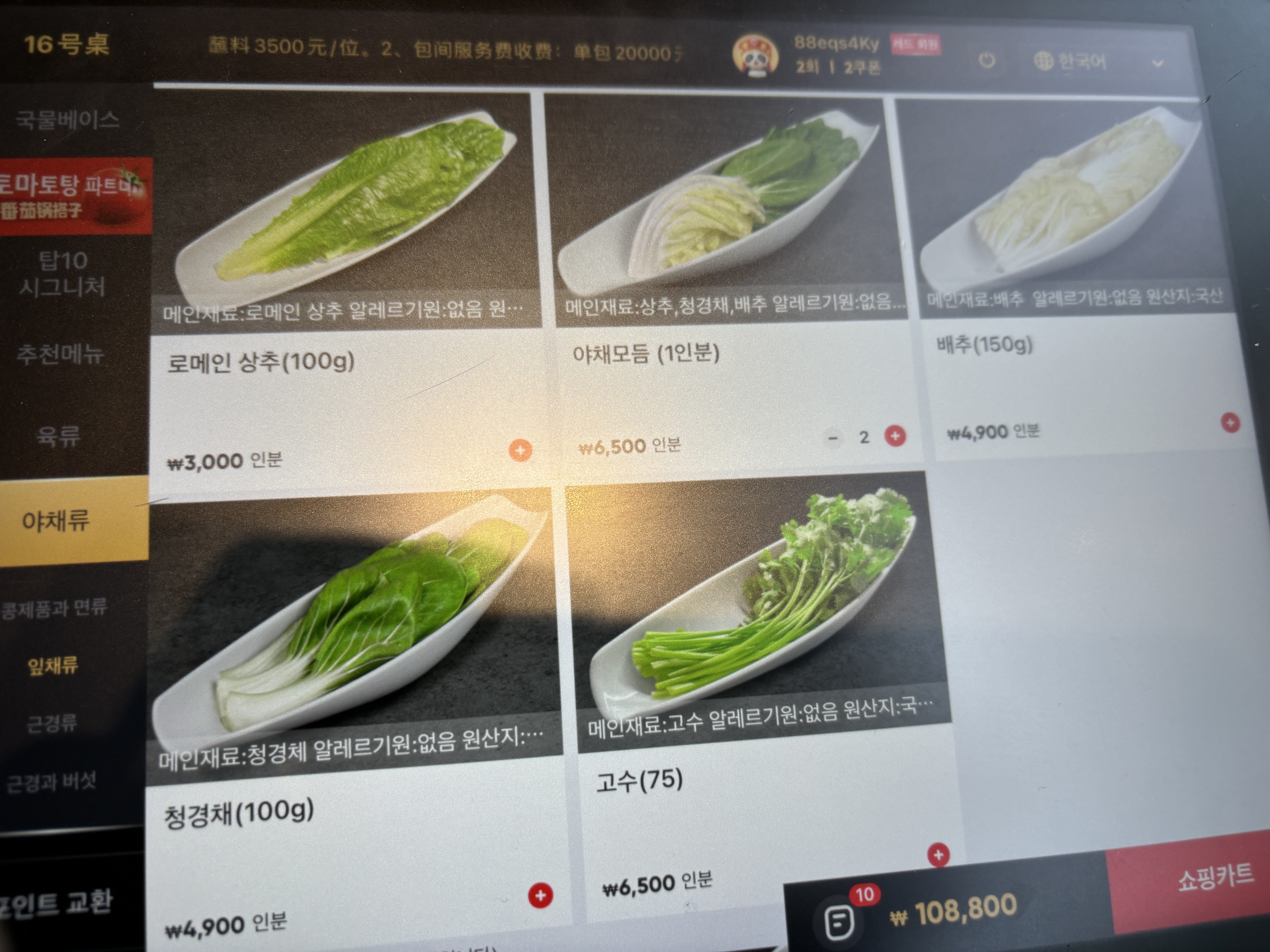 아 그리구 인당 셀프소스바?(소스 만드는 샐러드 바 이용하는 거!)도 구매해야 해요. 첫 번째 주문엔 11만 원 좀 넘게 나왔네요. 아래 태블릿 우측 위에 전체 가격 나옵니다!