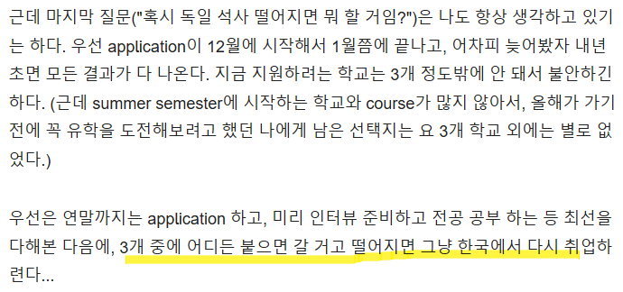 위의 독일 유학 첫 글에 썼듯이, 독일 유학 도전해보고 떨어지면 한국에서 다시 취업(이직)하겠다..라고 마음을 먹었었다.