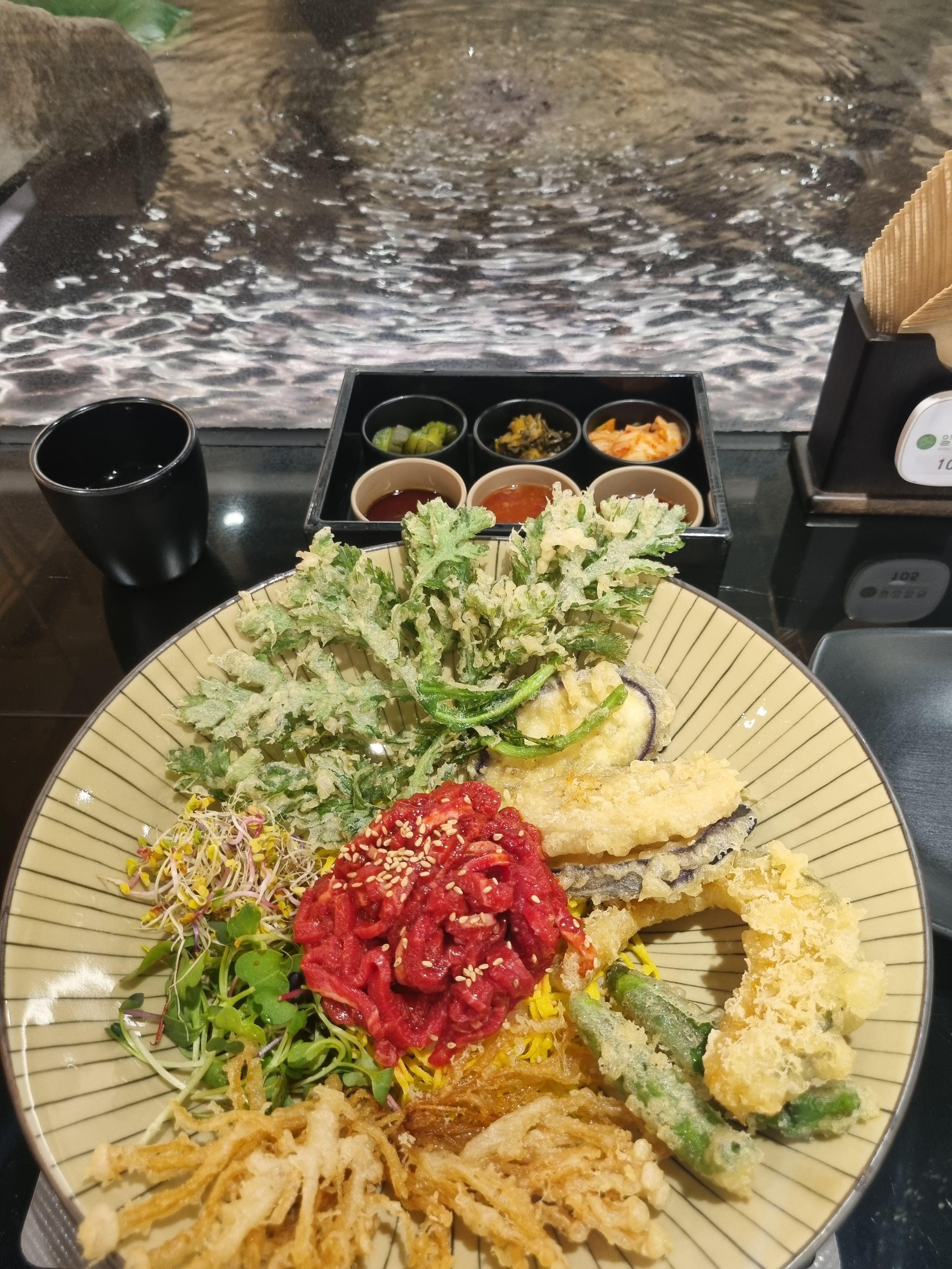 야근할때 법카로 비싼 밥 먹으려고 일부러 맛있는거 찾아먹음...ㅎ 고속터미널 파미에 스테이션 안에 있는 일상정원이라는 곳에서 한우육회텐동인가..먹었다. 식탁 앞에 강이 흘러서 신기해서 사진 한 장 찍어주고 맛있게 먹음.