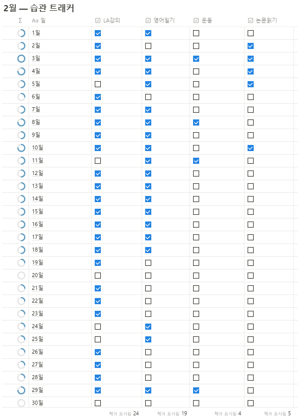 올 해도 역시나 3순위 목표 안에 넣었고, 아래처럼 habit tracker로 관리하기 위해서 LA강의(유튜브 라이브 아카데미 하루 한 강 이상), 영어 일기 쓰기 항목을 꾸준히 하고 있다.