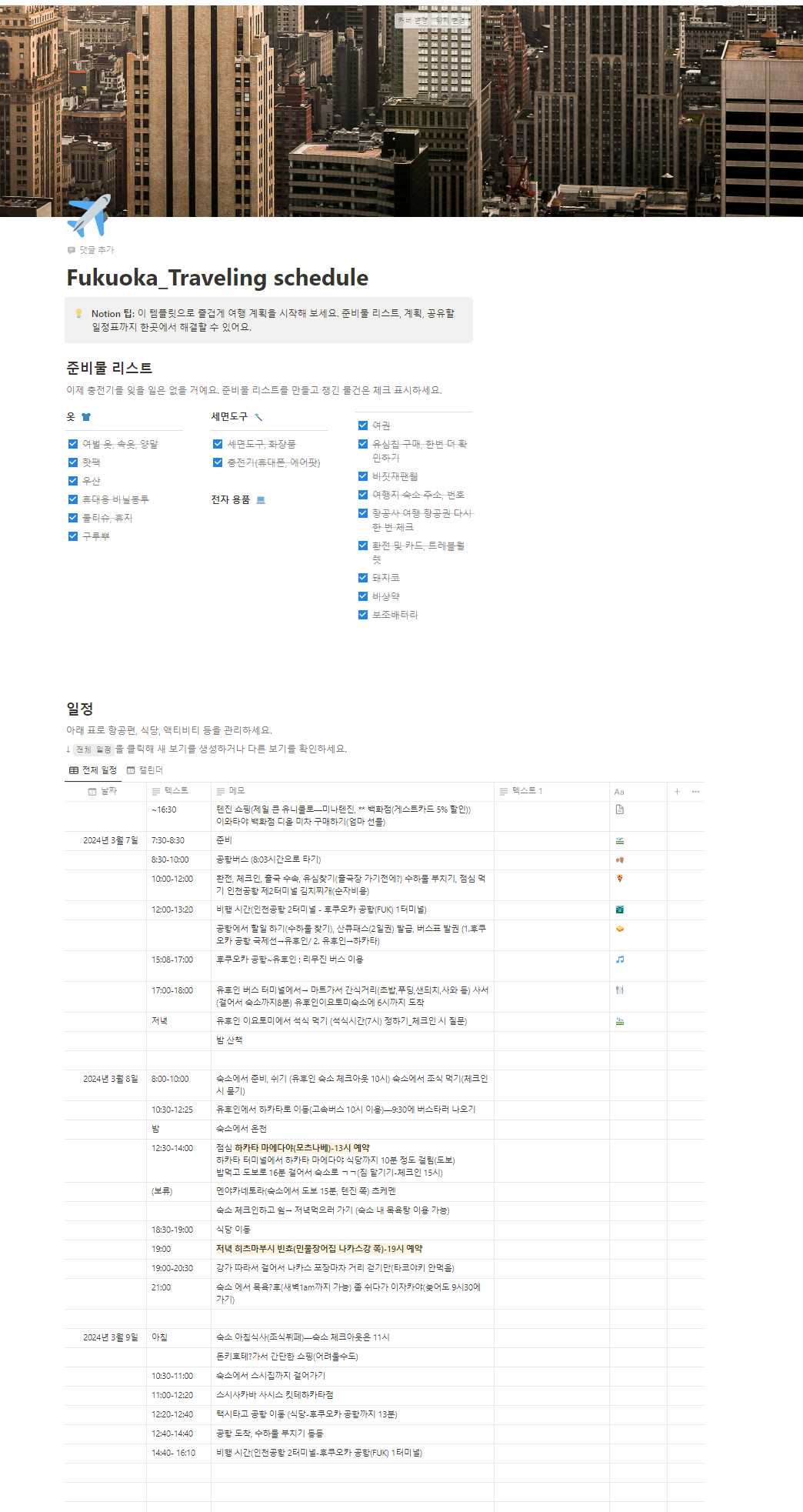 2024.03.10 - [여행/일본여행(2024.03)] - 일본 후쿠오카 여행 기록(1)_ 2024.03.07-2024.03.09_비짓재팬웹 동반가족등록, 진에어 모바일체크인노션에 기록한 계획대로 움직였다. 대충 숙소랑 비행기만 예약 해두면 80%는 완성이고 나머지는 걍 밥 뭐먹을지만 정하면 됨. 부모님이랑 가는 여행이다보니 기다리지 않고 바로 먹는 식사가 좋아서, 웬만하면 다 한국에서 미리 예약함.첫날 여행지는 유후인이었다! 한적한 시골마을 느낌+ 온천을 즐길 수 있는 힐링코스 :)다행히 집 앞에 공항버스 정류소가 있어서 공항버스타고 인천공항 제2터미널로 감~~유심은 미리 집에서 배송받았고, 체크인은 여행기록(1)에 썼듯이 진에어 모바일 체크인으로 미리 좌석지정도 했다. 그래서 공항 가자마자 환전만 ..